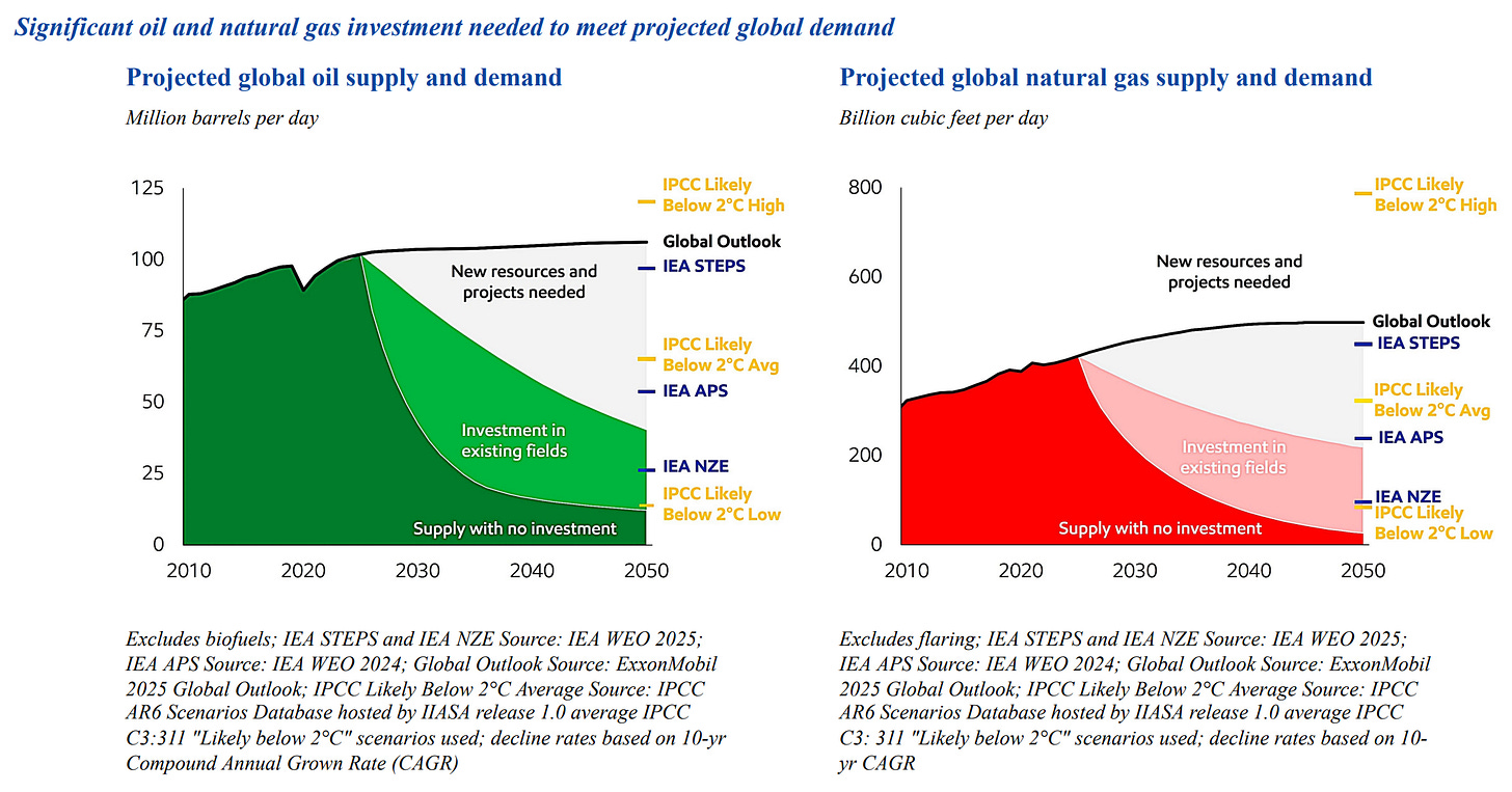 “Our Outlook projects that oil demand will remain above 100 million barrels per day to 2050. Even under the average of IPCC Likely Below 2°C scenarios, oil demand still comes to 65 million barrels per day in 2050 – about two thirds of current consumption. Our Outlook shows oil production declines at a rate of about 15 percent per year. At that rate, in the absence of continued investment, by 2030 oil supplies would fall from 100 million barrels per day to less than 30 million barrels, more than 70 million barrels per day short of what is needed to meet demand. Limiting investment to only existing fields would slow the decline to about 4 percent; however, this would still be well below the oil demand in the average of IPCC Likely Below 2°C scenarios. To meet projected demand, the Corporation anticipates that the world’s available oil and gas resource base will grow, not only from new discoveries, but also from increases in previously discovered fields. Technology will underpin these increases. The investments to develop and supply resources to meet global demand through 2050 will be significant and would be needed to meet even rapidly declining demand for oil and gas envisioned in aggressive decarbonization scenarios.”