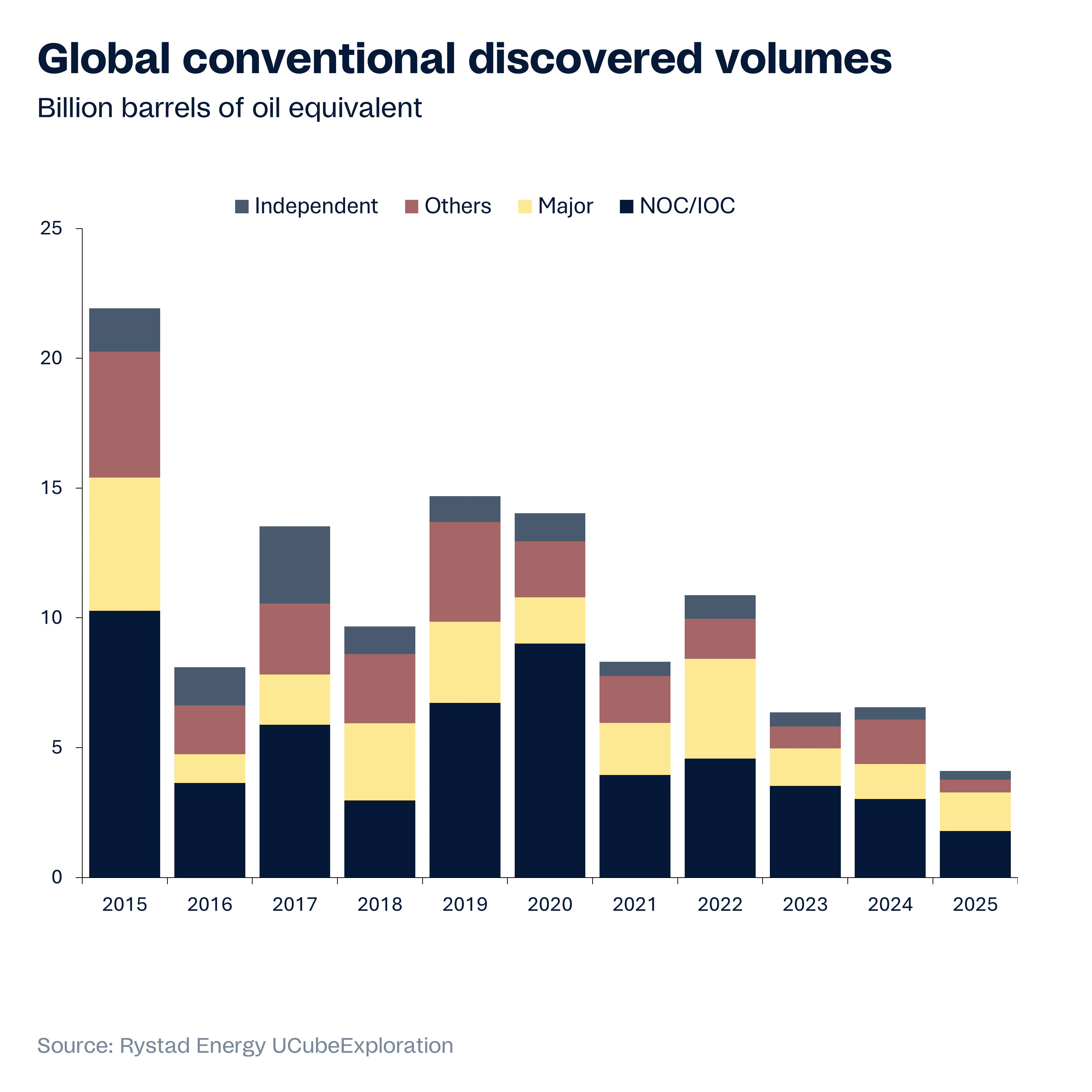 El caso es que la zona gris solo se puede cubrir con desarrollos procedentes de nuevos descubrimientos y estos brillan por su ausencia en los últimos años, como se puede comprobar en este gráfico de Rystad Energy. Si 2023 y 2024 fueron realmente malos, 2025 ha sido el peor año en muchísimo tiempo (y ojo que son descubrimientos de gas-petróleo).